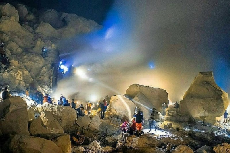 Nach dem Frühstück um 6 Uhr morgens fahren wir mit ein Jeep zum Paltuding und es beginnt eine etwa 2 stündige Wanderung. Sie begegnen Arbeitern, die eine schwere Last auf den Schultern tragen. Es handelt sich um Schwefelblöcke, die im Ijen-Krater abgebaut werden. Am Krater angekommen, bietet sich Ihnen ein einmaliges Landschaftsbild.Schwefeldämpfe steigen aus der Tiefe herauf, der See ist türkisblau.Sie können ein Stück in den Krater hinabsteigen, um den Schwefelabbau zu beobachten. Nach der Wanderung geht die Fahrt nach Ketapang und zurück nach Bali.